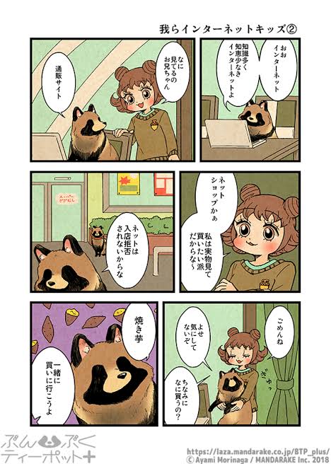 The tanuki is simply trying to buy roasted sweet potatoes online, yet he speaks in such an overly dramatic way that the whole scene feels strangely surreal.
